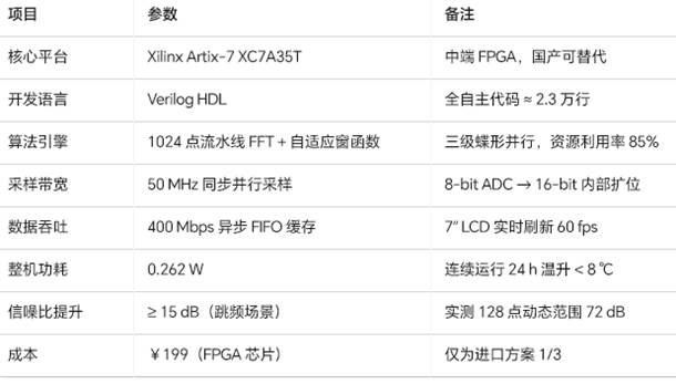 在算法核心上,团队攻坚克难,对经典的FFT算法进行了深度优化。通过引入并行流水线架构和自适应滤波技术,系统在面对工业现场复杂的电磁干扰时,展现出卓越的鲁棒性。实测数据显示,其信号分离准确率高达98%以上,信噪比提升超过15dB,在处理跳频等非平稳信号时,性能显著优于传统方案。