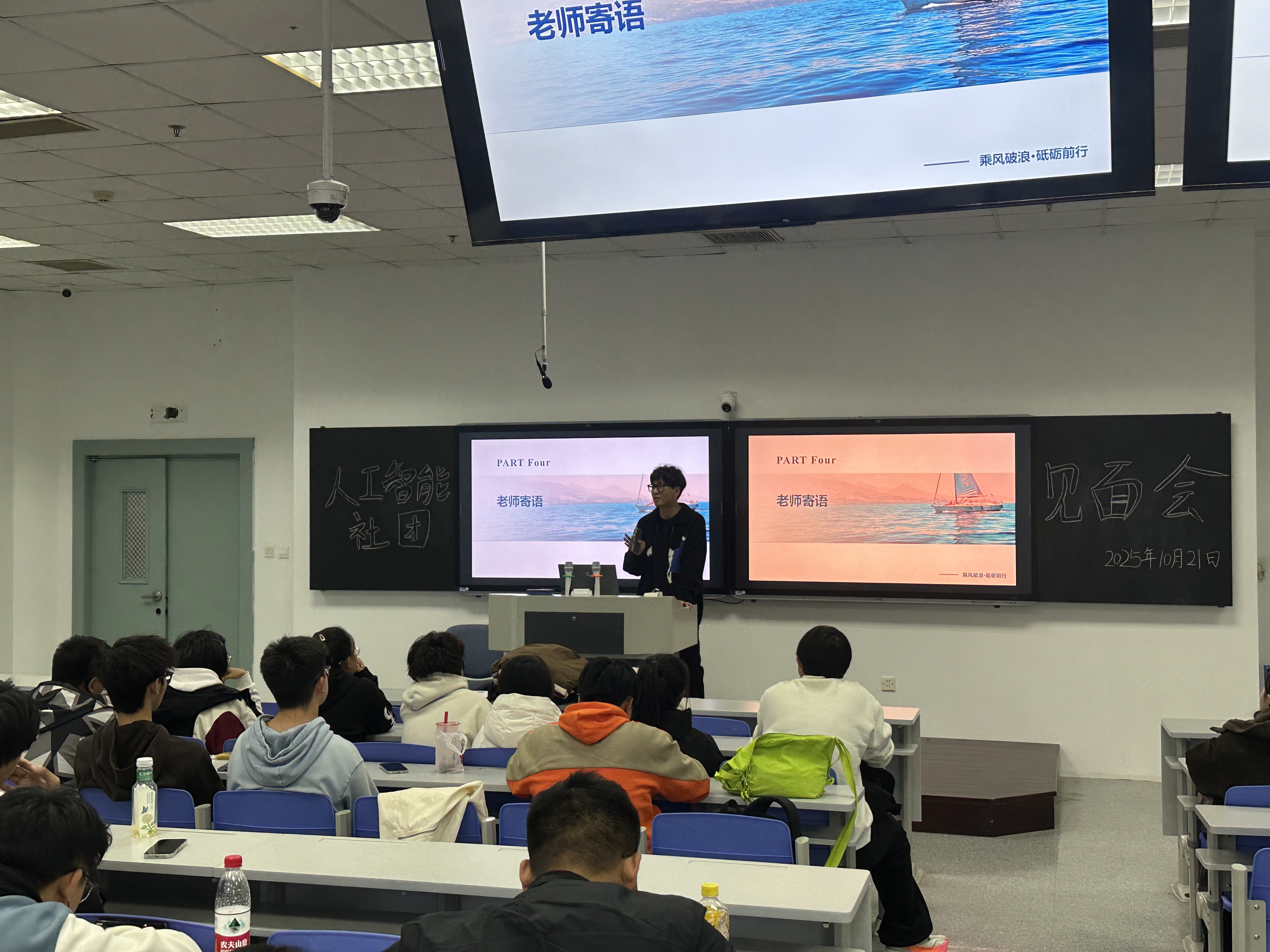 智能与通信工程系主任韩老师的发言,则让同学们感受到了系部对社团的全力支持与开放包容的态度。她首先对新加入社团的同学表示热烈欢迎,同时明确指出,智能与电子工程学院始终将社团作为培养实践型人才的重要载体,系部都会给予充分保障,为社团活动的开展与同学们的成长保驾护航。更值得关注的是,韩老师特别强调社团的开放性,不仅欢迎本学院学生加入,更期待各学院对 AI 领域感兴趣的同学参与其中,通过跨学科交流碰撞思维火花,实现知识的融会贯通,共同探索人工智能的多元应用场景。