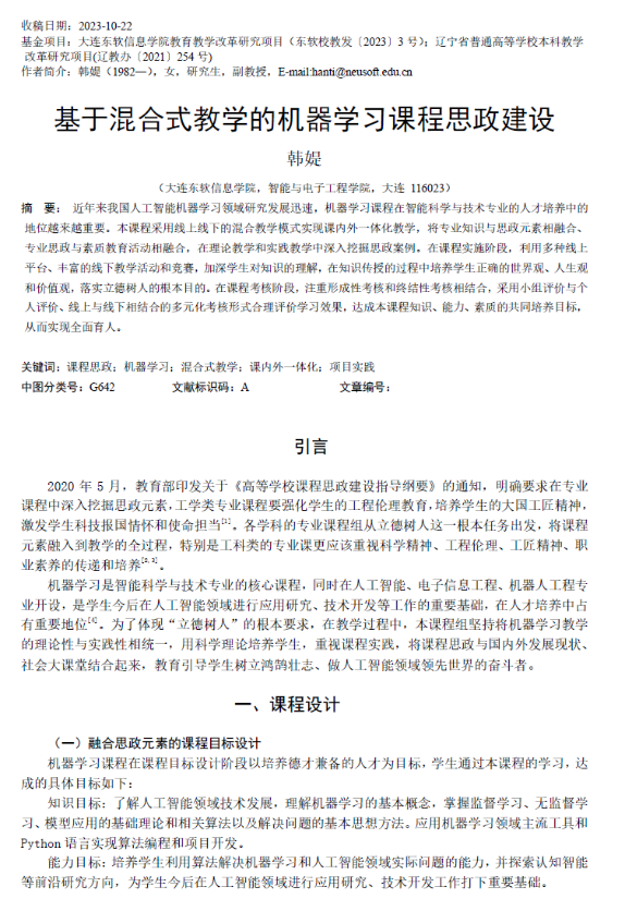韩媞.基于混合式教学的机器学习课程思政建设,首届立德树人铸魂润心高校课程思政研讨会论文集,2023
