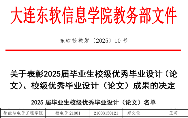 郑文俊,智能与电子工程学院微电子科学与工程专业 2021 级校友,共青团员,凭借扎实的科研积累与创新实践,其毕业设计作品获评 2025 年优秀毕设作品。不仅如此,在校期间他还斩获多项重量级荣誉,包括一带一路暨金砖国家技能发展与技术创新大赛之集成电路 ATE 测试技术赛项国家级二等奖、中国国际大学生创新大赛省级一等奖、“挑战杯” 中国大学生创业计划竞赛省级二等奖、辽宁省智能制造科普创意创新大赛省级二等奖等,每一份成绩的背后,都铺垫着他为毕设研究与专业知识累计付出的不懈努力。