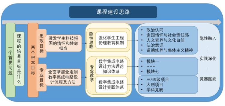 集成电路设计与集成系统专业作为我校国家级一流本科专业,基于教育部的指导纲要,以学校“教育创造学生价值”为理念,以教书育人为目标,采用“专业教育+隐性思政、素质教育+显性思政”方式,开展全方位课程思政建设。