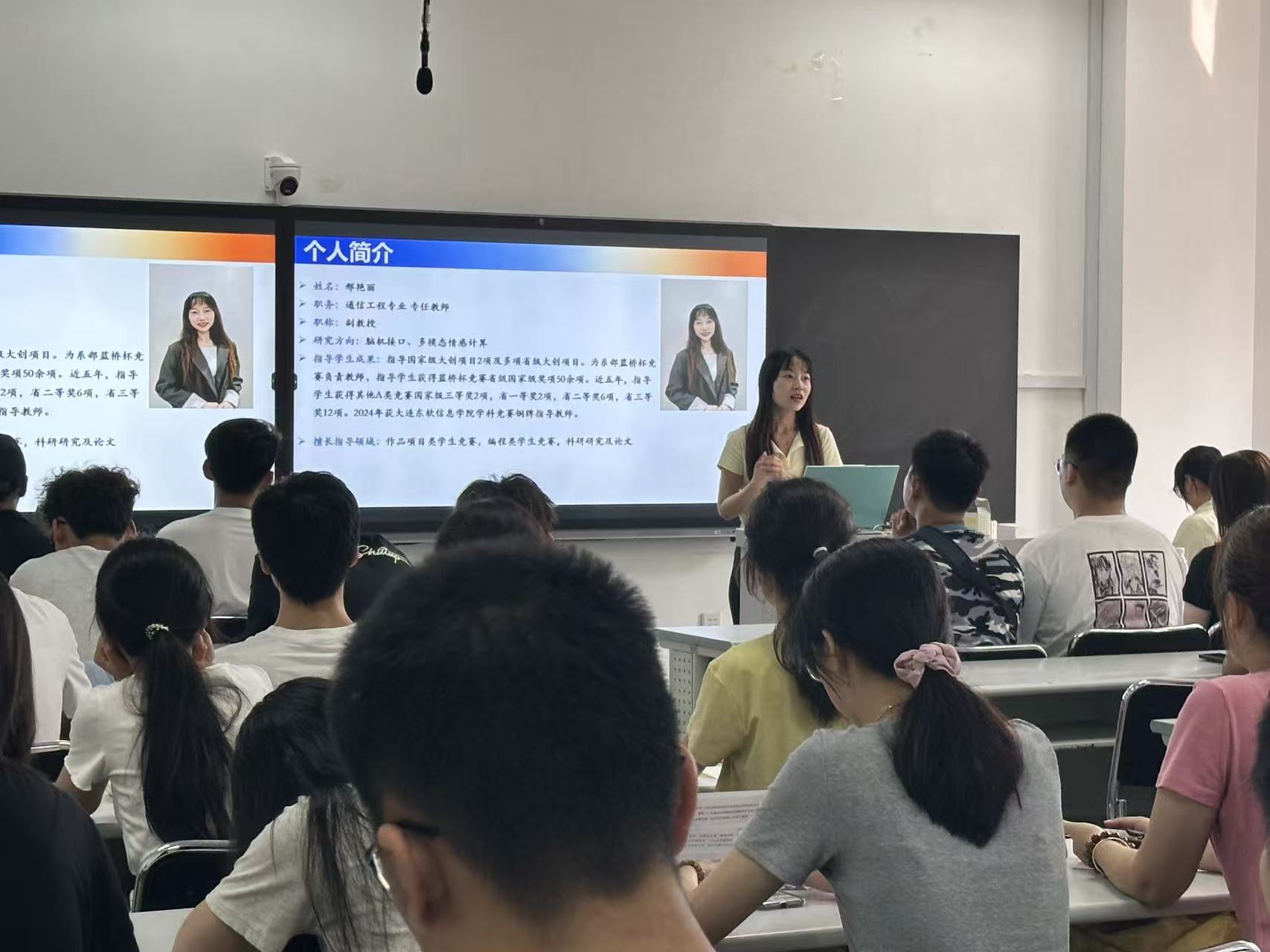 当日下午 1 点 30 分,见面会准时拉开帷幕。教室第一排整齐就座的专业教师团队,成为现场最亮眼的 “智囊团”。他们中既有深耕教学科研多年的资深副教授,也有具备企业实战经验的双师型教师,更有海外名校背景的青年才俊,多元的师资结构让新生们充满期待。随着介绍环节的开启,老师们依次走上讲台,结合个人研究方向、教学成果与育人理念,向新生们展现通信工程专业的学科魅力与发展潜力。