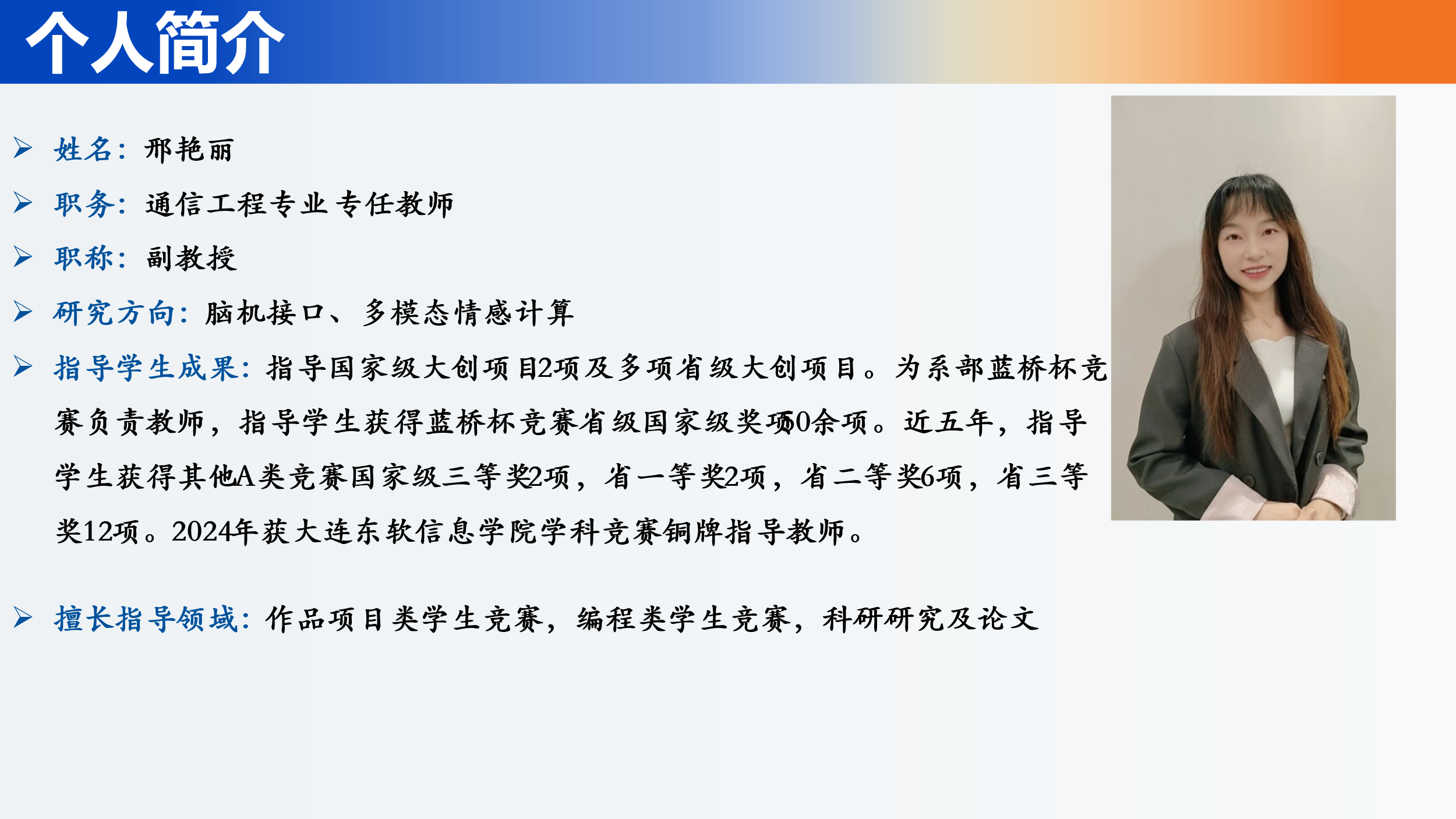 邢艳丽副教授的分享格外吸引新生目光。作为脑机接口、多模态情感计算领域的研究者,她重点介绍了指导学生竞赛的丰硕成果 —— 累计指导蓝桥杯竞赛省级国家级奖项 50 余项,近五年带领学生斩获 A 类竞赛国家级三等奖 2 项、省一等奖 2 项,2024 年获评校级学科竞赛铜牌指导教师。“无论是编程类竞赛、作品项目类比拼,还是科研论文撰写,专业都能为大家提供全方位指导。” 她的话语为有竞赛与科研意向的新生注入强心剂。