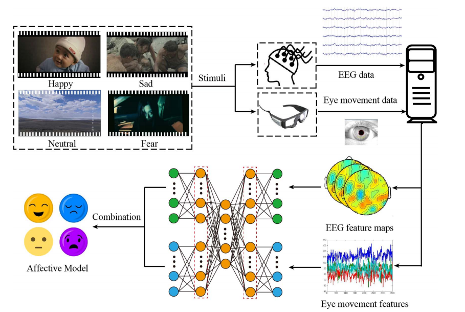 目前团队已在核心研究方向上取得阶段性进展。在情感计算与心理健康评测的关键技术研发中,团队创新采用“情感诱发+多模态数据采集+模型训练”的技术路径:通过情感影片精准诱发不同类型情绪,同步以连续标签标注情绪等级,再基于观影过程中采集的脑电图(EEG)、眼动信号等多模态数据集开展模型训练,最终在自主研发的自适应模型中实现高效情绪识别。这一阶段性成果不仅验证了研究思路的可行性,更为后续心理健康评测模型的落地应用筑牢了技术根基。