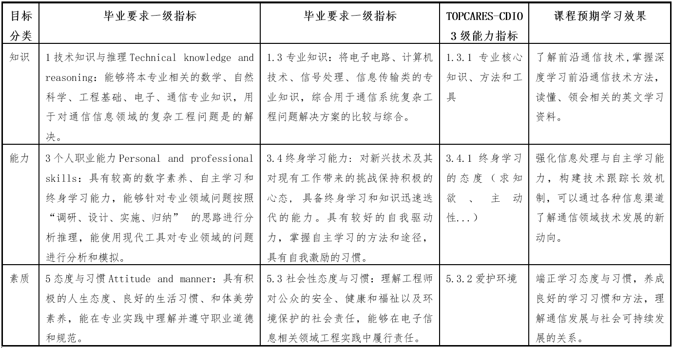 素质目标:端正学习态度与习惯,养成良好的学习习惯和方法,理解通信发展与社会可持续发展的关系,该目标对应TC能力指标的5.3.2爱护环境。