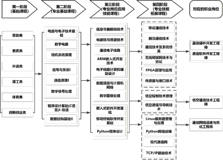 学生通过通识课、基础课、专业课的学习,最终可成为通信硬件/软件开发工程师、低空通信技术工程师、通信网路运维与优化工程师等。