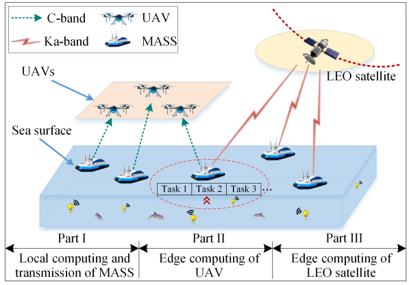 随着海洋经济的快速发展和智能化应用的不断普及,“智慧海洋” 相关应用与服务产生了海量计算密集型和时延敏感型任务,对海上通信和计算能力提出了新的要求。海上边缘计算网络作为一种新兴范式,可将繁重计算任务迁移至边缘服务器处理,为用户提供高效的计算服务。然而,海上通信和计算资源都极为有限,单纯依赖海洋设备很难满足上述要求。为此,论文以面向第六代移动通信技术的空天地海一体化网络架构为依托,突破海上“资源孤岛”限制,构建“跨域协同”的海上边缘计算网络。 论文面向海上无人船的业务需求,以海上特殊的通信环境为基础进行建模,构建了天基和空基协同辅助的海上边缘计算网络模型,并提出相应的任务卸载和资源分配的解决方案。