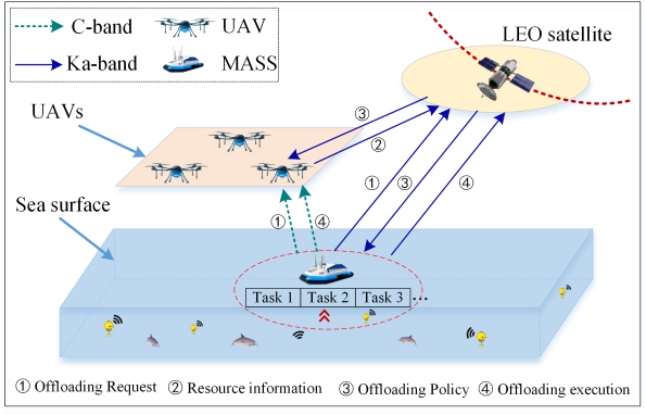 论文提出了一种用于空-天-海的综合网络(SAMIN)的双边辅助计算卸载与资源分配方案。在此场景中,无人飞行器(UAV)与低地球轨道(LEO)卫星均配备边缘服务器,为海上自主水面舰艇(MASS)提供计算支持。MASS可将部分计算任务通过多址接入方式同时卸载至UAV和LEO卫星进行处理。为在时延约束下最小化SAMIN的系统能耗,论文构建了一个联合优化问题,并提出了相应的节能优化算法,旨在协同优化LEO卫星与UAV的卸载模式、卸载量及计算资源分配。进一步地,论文采用交替优化(AO)方法与分层策略对原问题进行分解求解,以获得最优解。最后,通过仿真实验与现有基准算法进行对比,结果验证了所提方案在性能与能效方面的优越性。