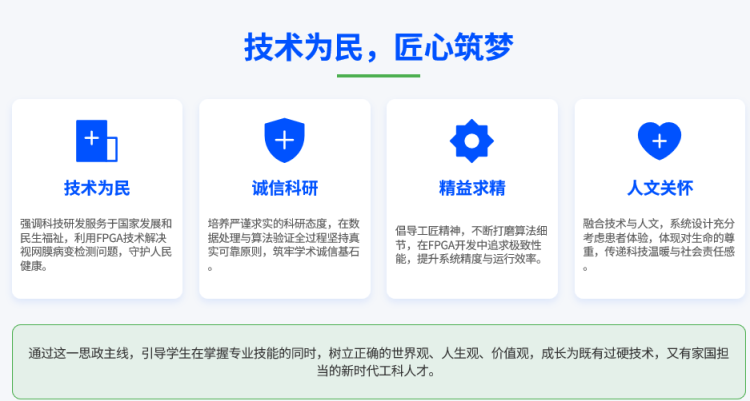同时,本次讲座融入相关思政元素,项目以“技术为民、诚信科研、精益求精、人文关怀”为核心,致力于将专业技能培养与价值塑造融为一体。首先,‘技术为民’是我们的出发点,我们希望用FPGA技术解决视网膜病变检测的实际问题,服务于人民健康。其次,“诚信科研”是我们的立身之本,我们将在整个研发过程中坚守学术诚信。再次,“精益求精”是我们的追求,我们将以工匠精神打磨每一个技术细节。最后,“人文关怀”是我们的温度,我们的设计将充分考虑患者的需求。通过这条主线,我们旨在培养出既有过硬技术,又有家国担当的新时代工科人才,让科技真正服务于国家发展和民生福祉。